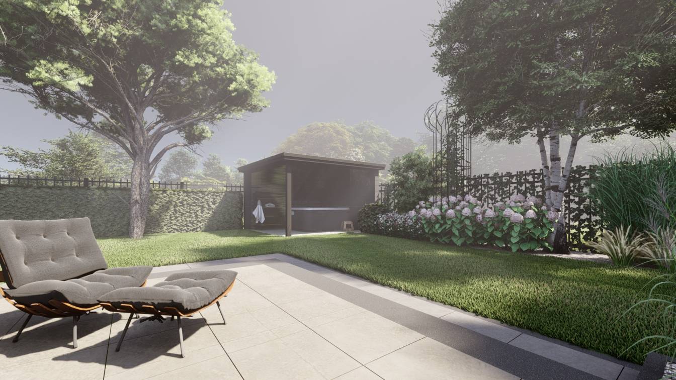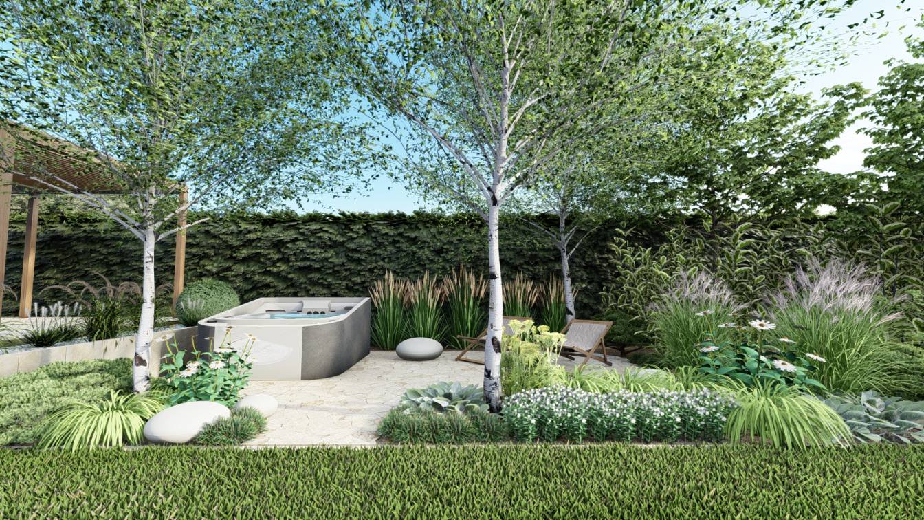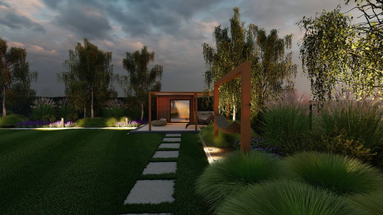 W jej wnętrzu zaplanowano wannę spa, która ma umilać wypoczynek w ogrodzie.