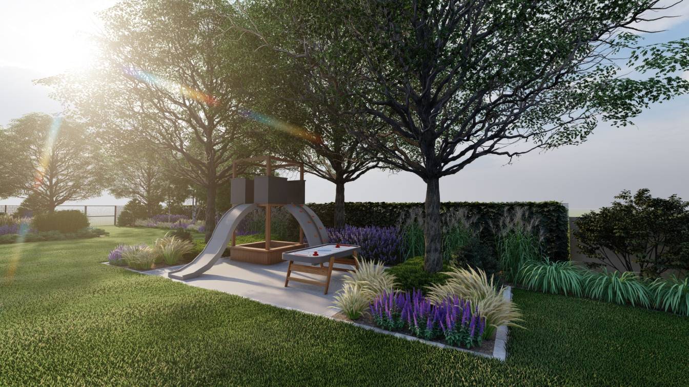 Bok działki przeznaczono na plac zabaw, ponieważ rośnie tam jedyne zachowane na terenie drzewo.