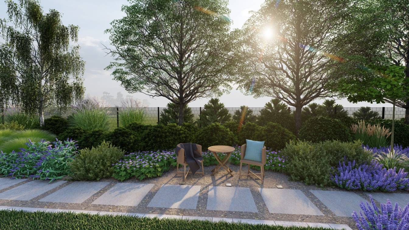 Dobór roślin miał osłonić działkę przed wiatrem i stworzyć intymną przestrzeń, odseparowaną od drogi.