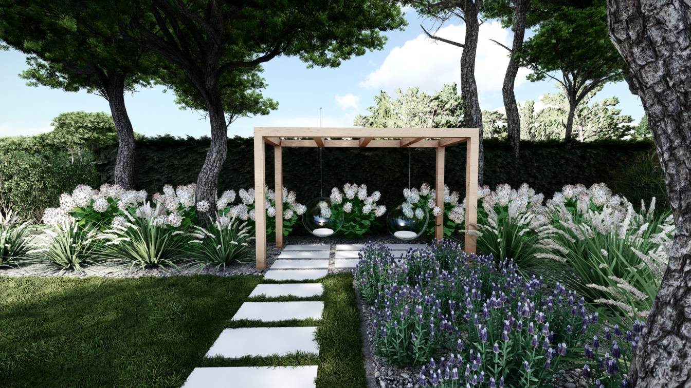 Z tarasu prowadzi ścieżka z betonowych stopni do pergoli z huśtawką lub hamakiem.