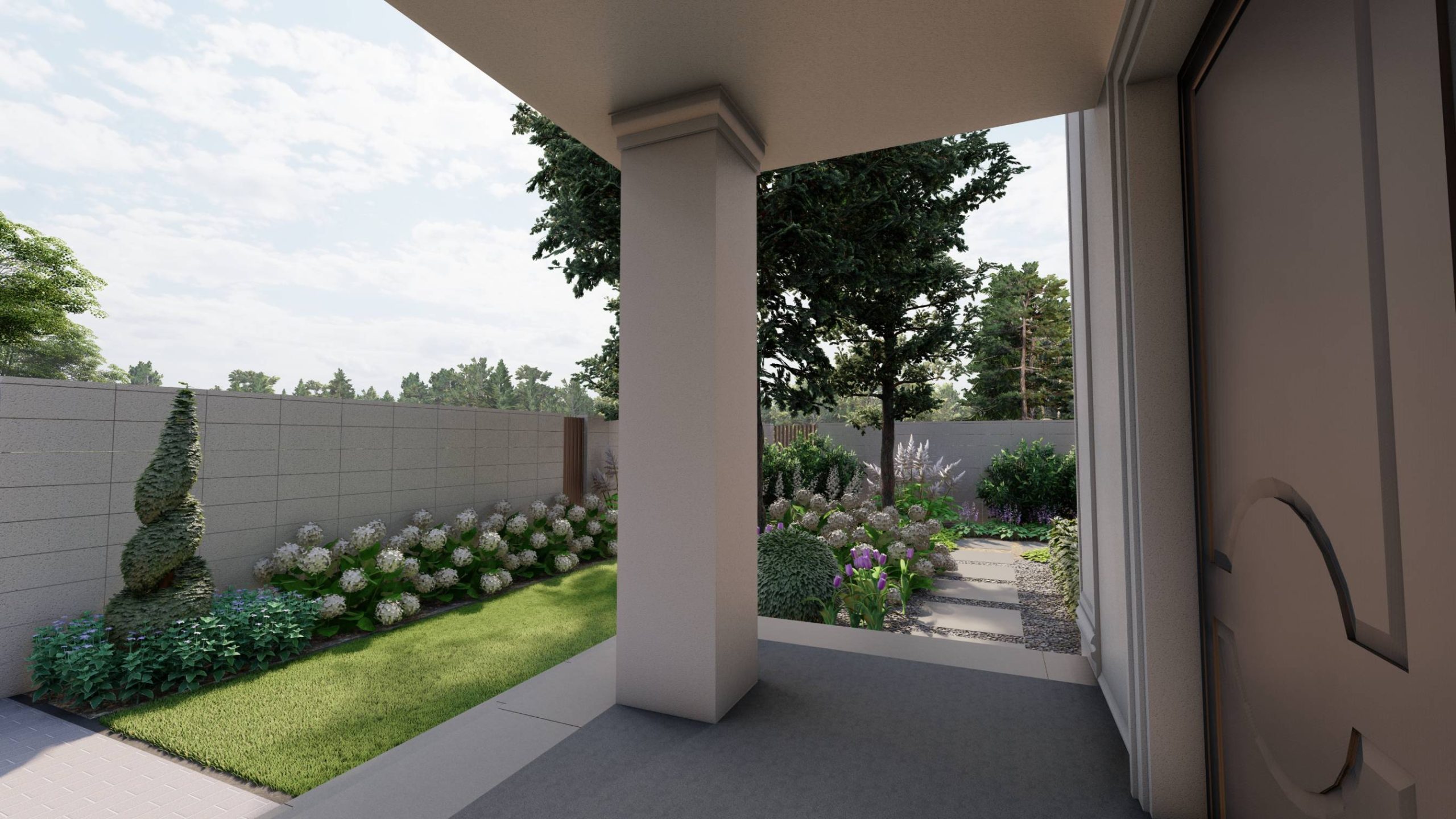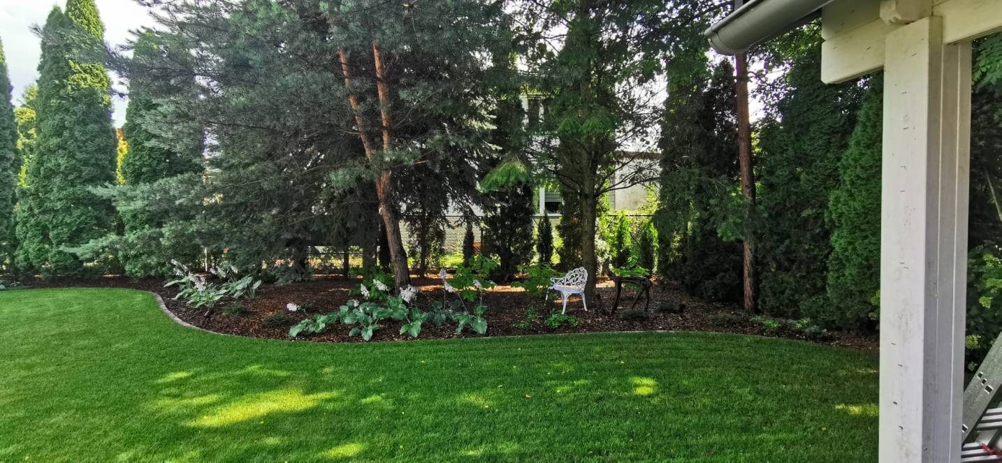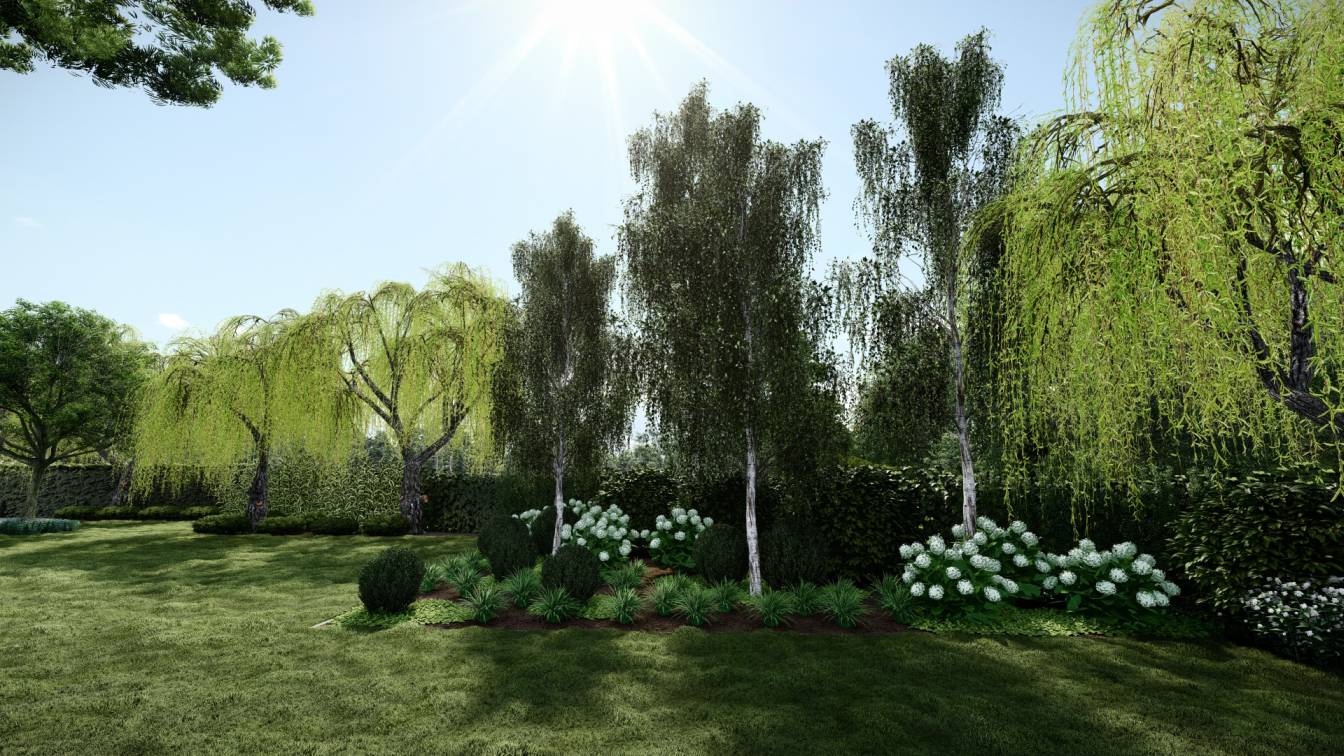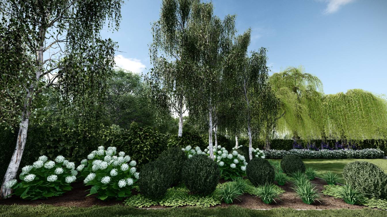 Roślinność w odcieniach zieleni z dominacją bieli, ulubionego koloru właścicielki.