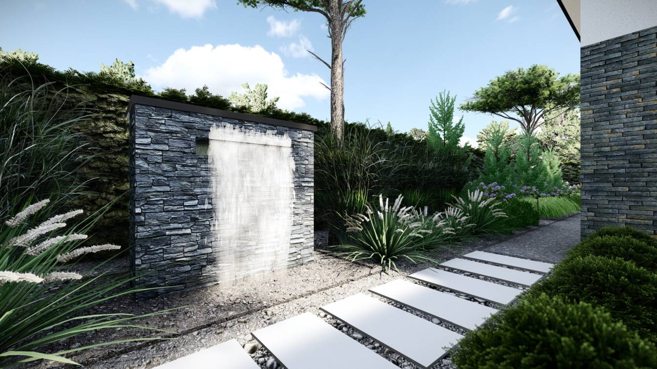 Przy tarasie z pergolą zaplanowana ściana z elementem wodnym.