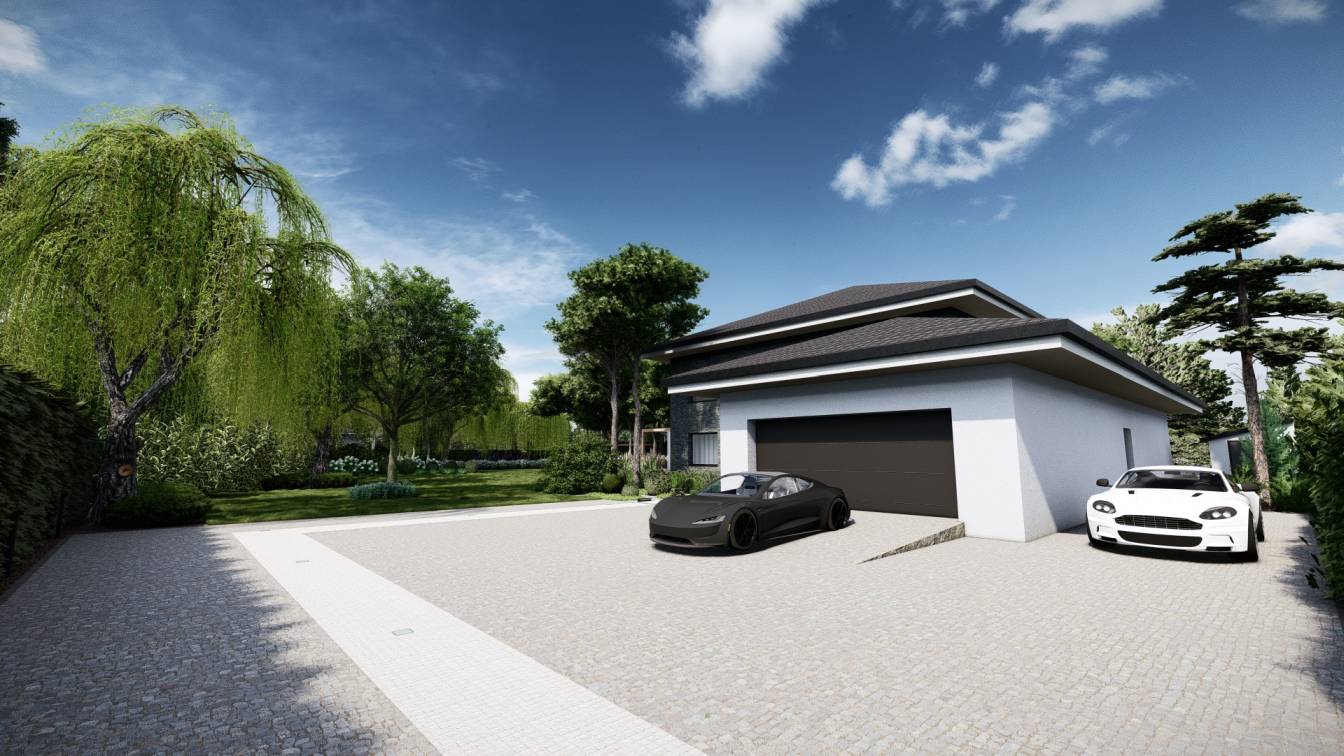 Podjazd zaplanowano jako szeroki, tak aby jednocześnie mieściło się na nim kilka aut.
