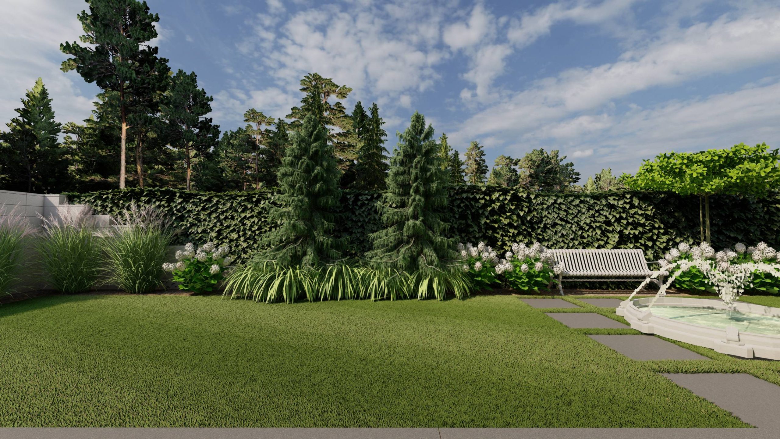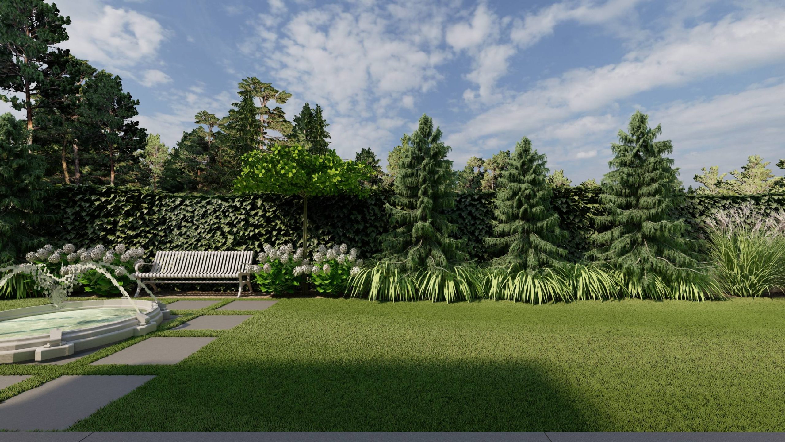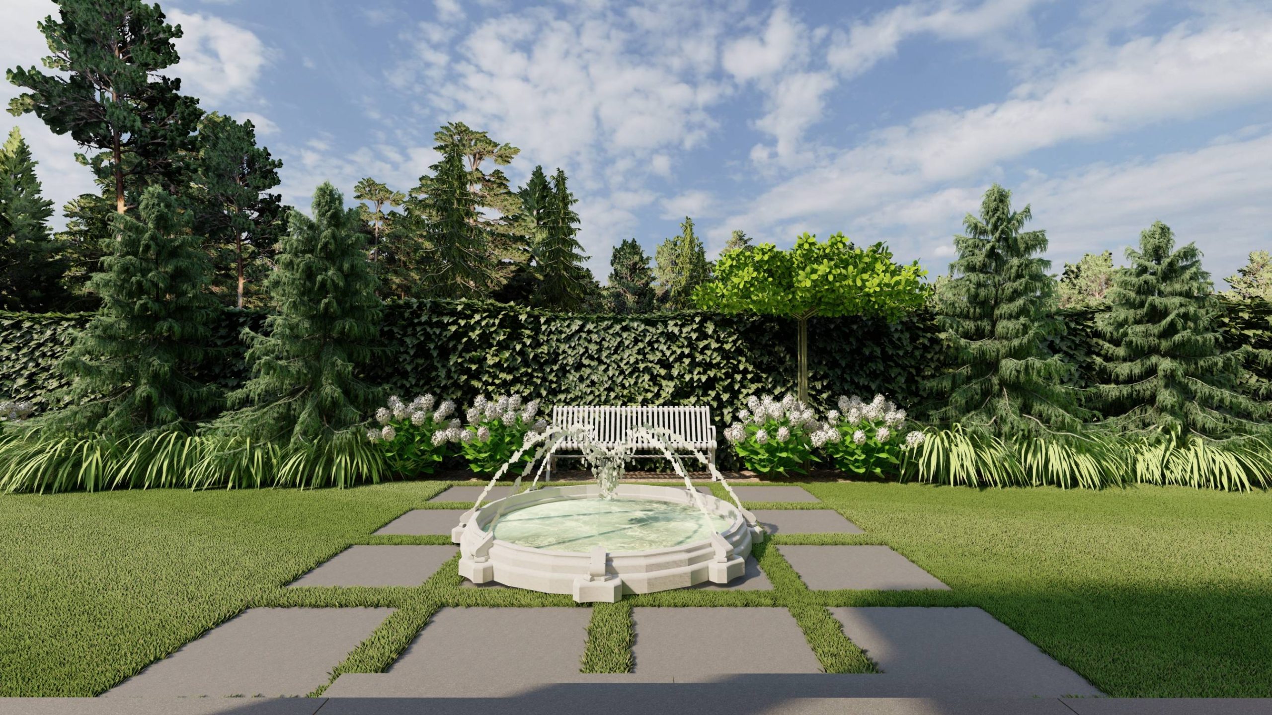 Fontanna stanęła na przecięciu drugiej, poziomej osi ogrodu, wyznaczonej przez lustro ogrodowe, fontannę oraz rzeźbę.
