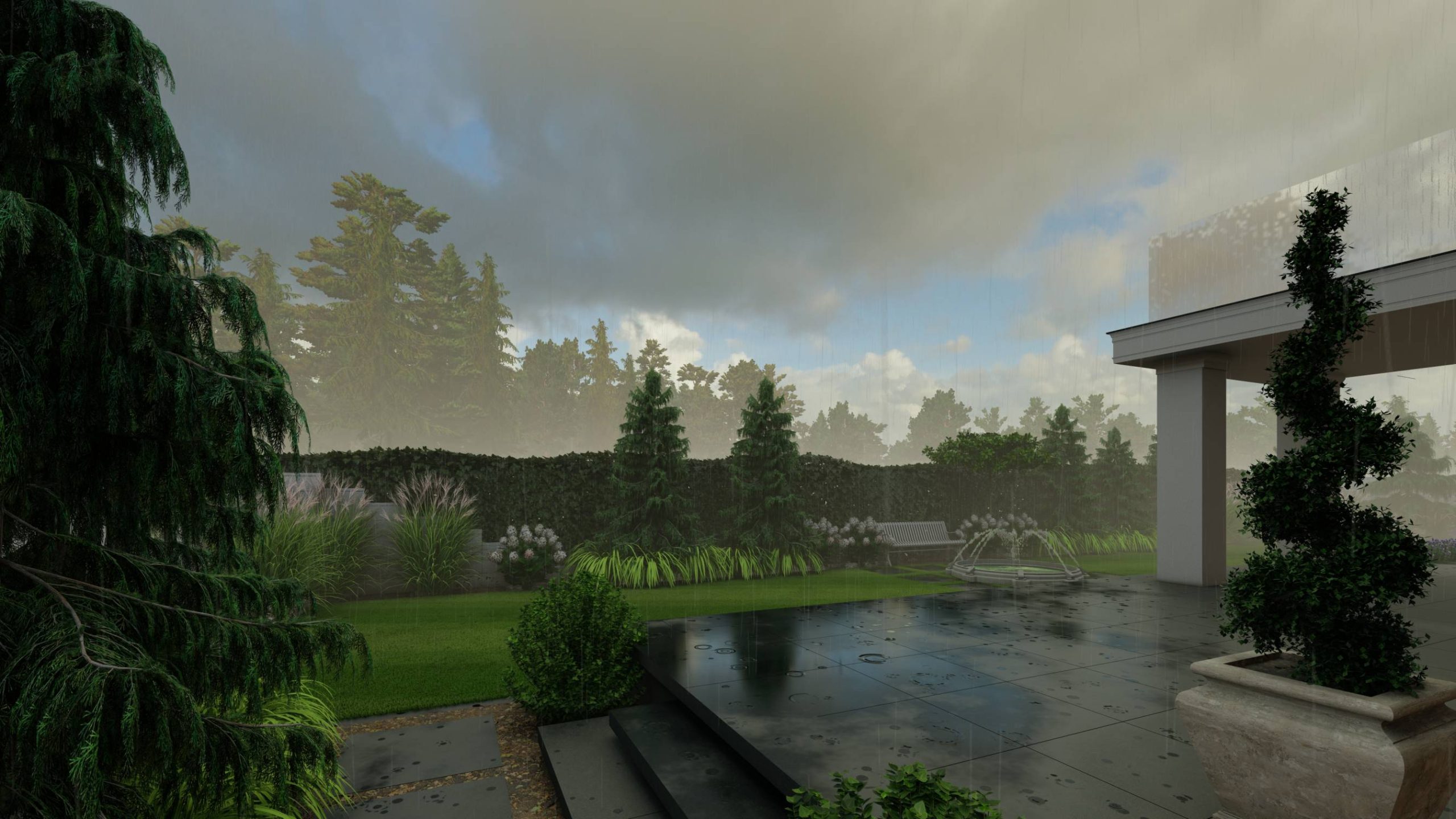 Na tyłach, na osi głównej budynku i w bezpośrednim widoku z salonu, umieszczono klasyczną fontannę.