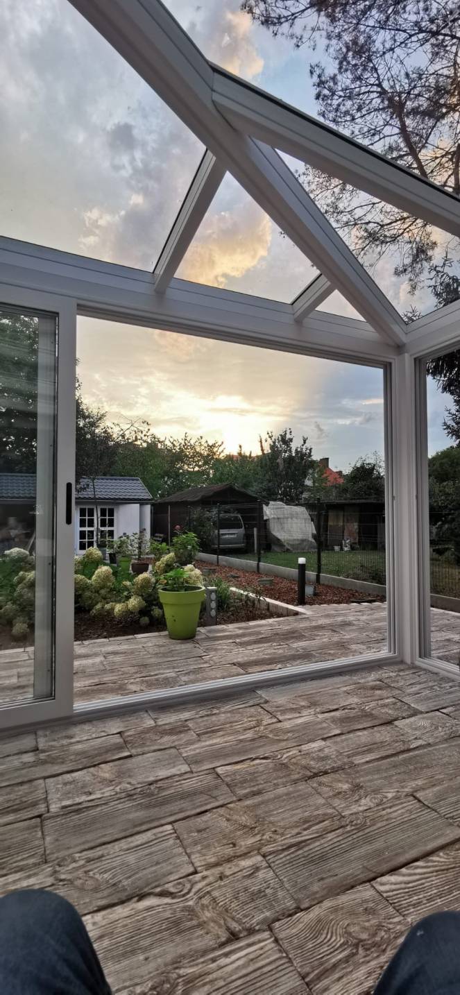 Altanę wykonano z dwóch pełnych ścianek z pustaków ogrodzeniowych, szczelnego płaskiego dachu oraz szklanej zabudowy.